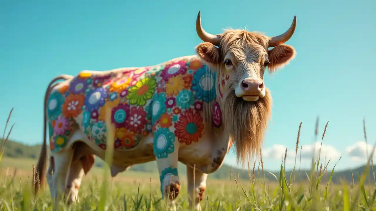 Envision a hyper-realistic, high-resolution image capturing a unique sight: a hippie cow with a beard. The cow is adorned with symbols of peace and love, its fur patterned with vibrant, psychedelic colors. A thick, shaggy beard hangs from its chin, adding to its unconventional appearance. The cow stands in a lush, green pasture under a clear blue sky, embodying the free-spirited ethos of the hippie movement. The colors should be a mix of the natural hues of the cow and the pasture, contrasted with the vibrant colors of the hippie symbols. The composition should be a mid-shot, focusing on the cow and its unique features.