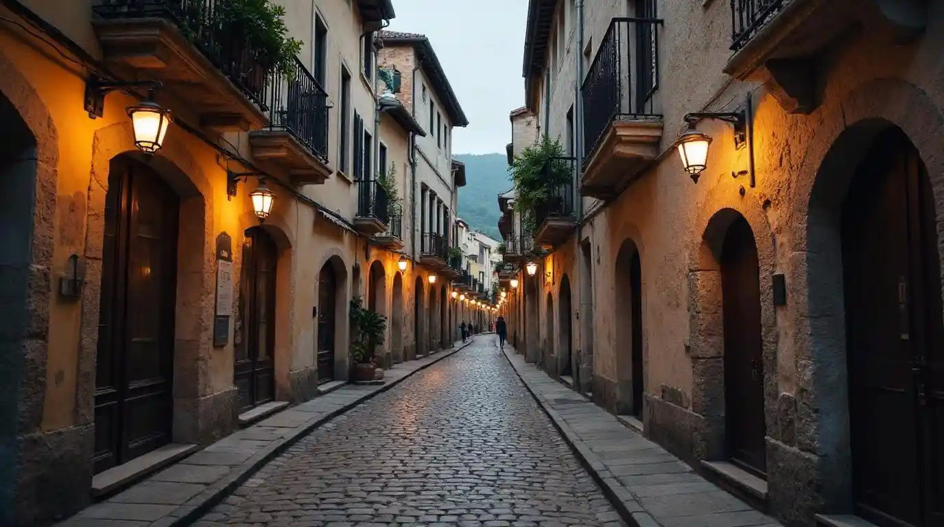 Cobblestone streets of a medieval town, with lanterns lighting up historic facades.