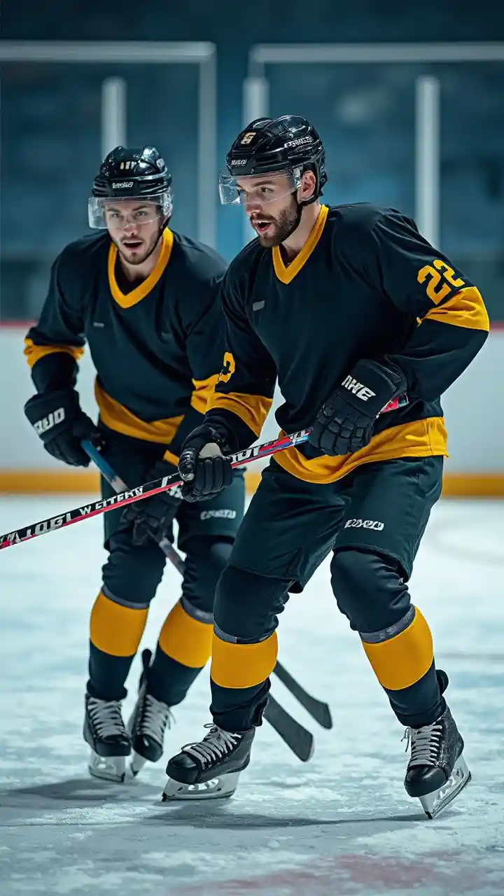 (full body image of two men), (dynamic poses), (black plastic hockey uniforms with vibrant yellow details), high energy atmosphere, dramatic lighting, (HD), large ice rink in the background, icy textures, (intense expressions), sporting a competitive stance, details of hockey sticks and helmets, bold color contrast, capturing the essence of teamwork and athleticism.