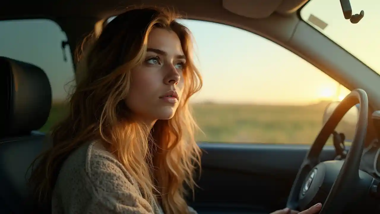 A young woman sits in the passenger seat of a car with her gaze intensely fixed on the horizon. Her long hair cascades down, catching the sunlight that filters through the window. Her expression is a mix of determination and vulnerability, reflecting the internal chaos she feels. The car's interior is dimly illuminated, contrasting with the brightness outside, as if she's on the cusp of a significant revelation. The landscape whizzes by, blurring into streaks of color, symbolizing her turbulent emotions and the rush of her journey towards an uncertain future.
