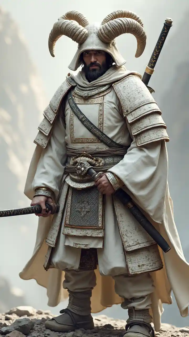 A Human with ram horns in white Celestial Guard Samurai armor with a Katana