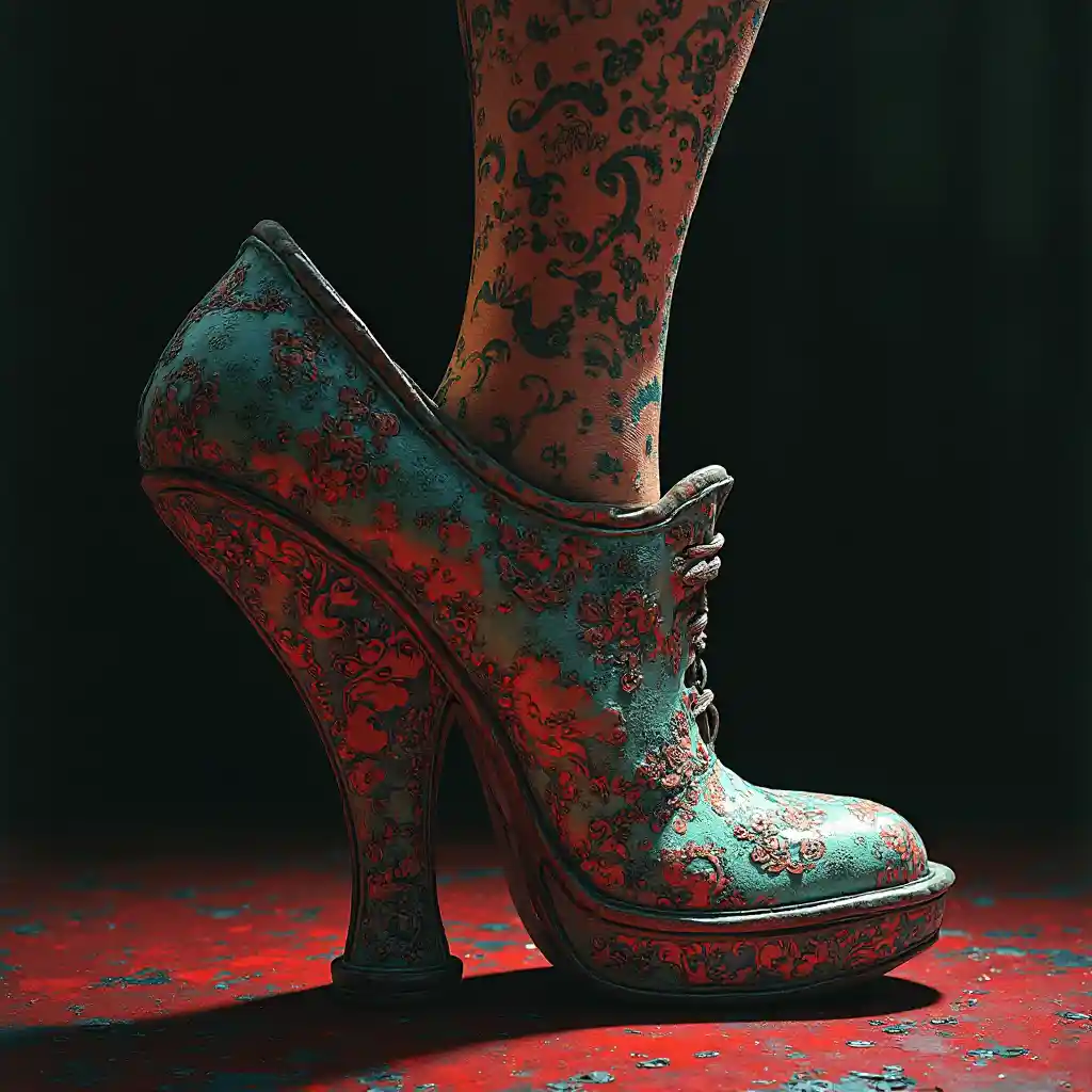 Shoe horror Fashion design, Studio Lighting, by Junji Ito and Naoto Hattori, Stanley Donwood, pattern, cinematic lighting, dramatic, Surreal hyperrealism, concept art, character design, Anna Dittmann, Brian M Viveros, Anime, Manga, Horror, depth, in the style of Nightmarish designs
