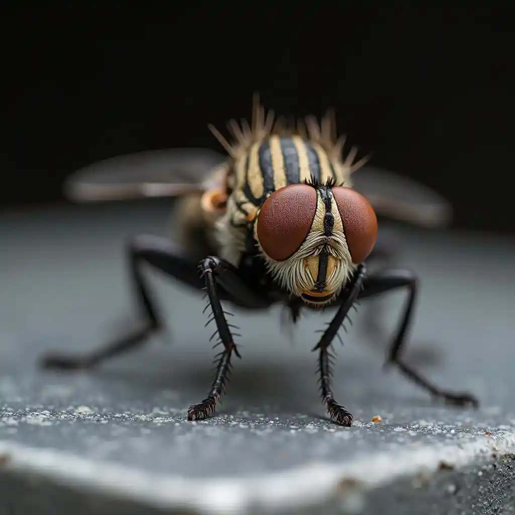 macro housefly in metal table, shapen detailed, f/22, in focous, center shoot up camera