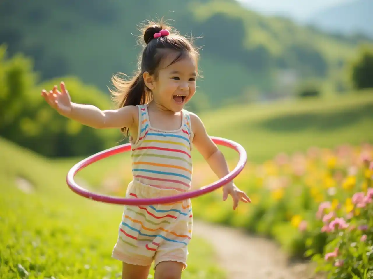 A 6-year-old Asian girl with a ponytail twirls a hula hoop in a sunny park, wearing a dress with rainbow stripes. Blooming flowers and green hills frame her, her joyful spins radiating playfulness and sunny delight in a vibrant, outdoor setting.