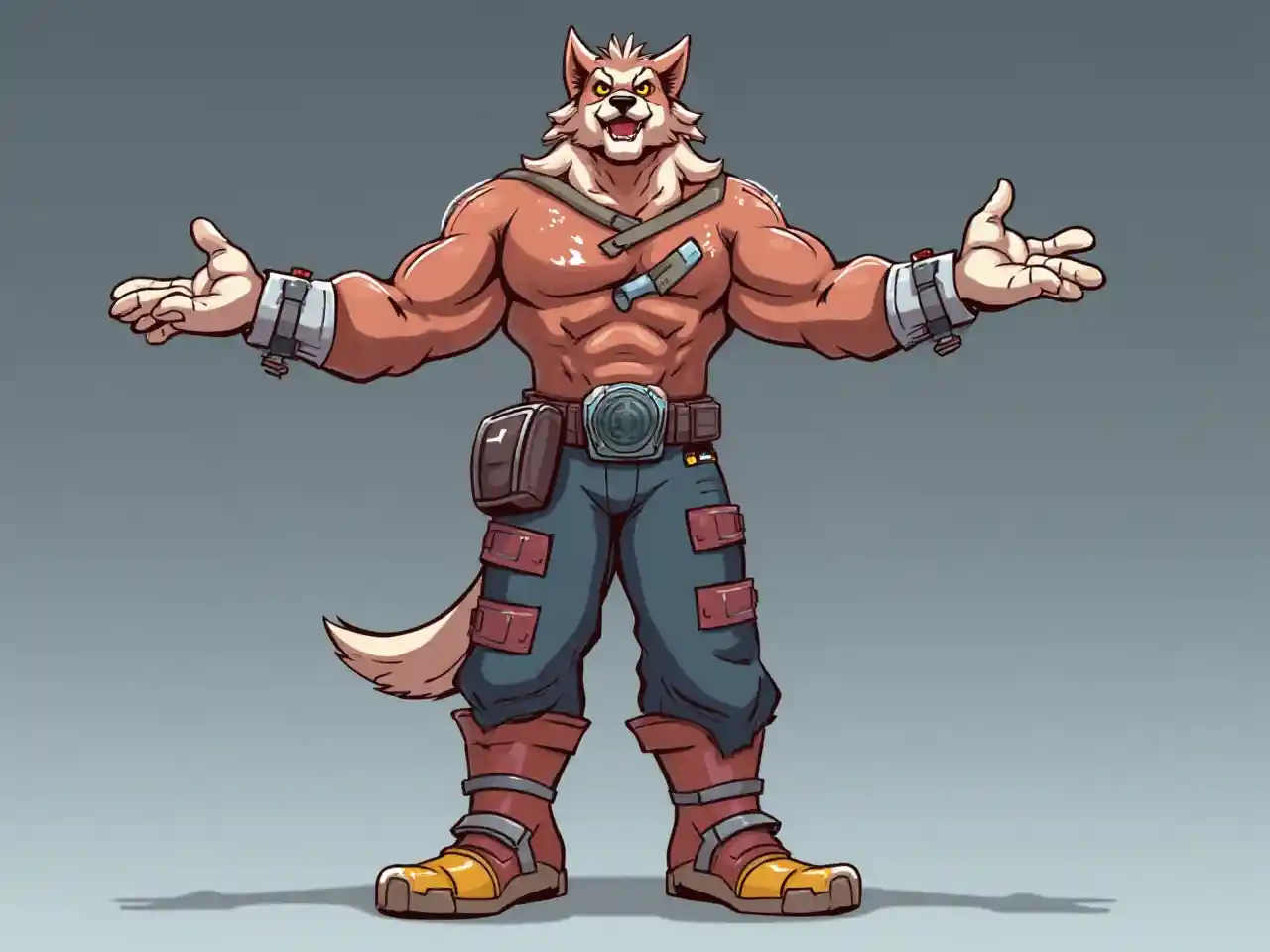 Generate a humanoid character in a T-pose, with arms fully extended and palms open symmetrically. The character should have the body proportions of a human but with the head of an animal (such as a wolf, lion, or other strong animal). Design it in a cartoonish, colorful style similar to Brawl Stars, featuring a mix of bold shapes and sharp details. The outfit should be simple yet striking, with vibrant colors and stylized elements like thick boots, gloves, and a utility belt.