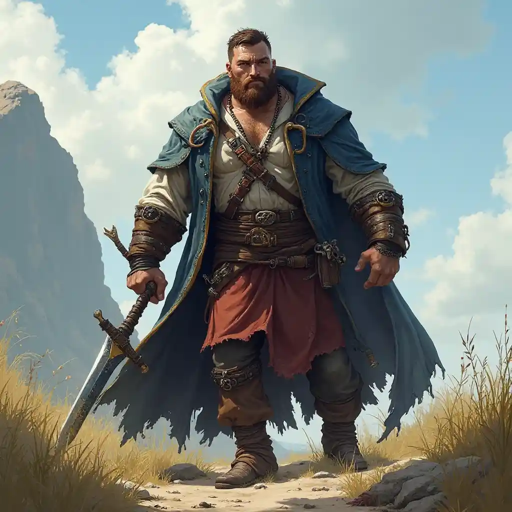 KennedyMale heavy-set fit fat large 37-year old hunky pirate mage with short-cut hair and beard, holding magic fantasy-weapon, on a windy coastal field, pathfinder, d&d setting, enhanced shadow quality
