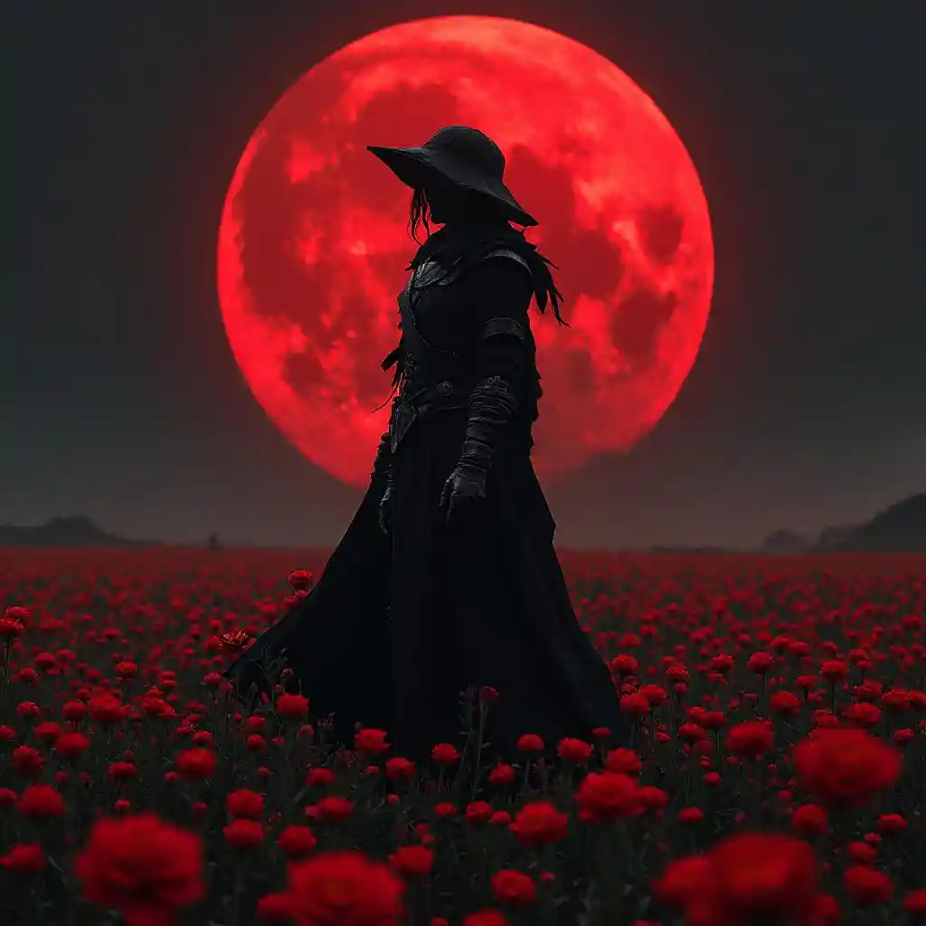 DavidA bloodborne style hunter dressed in black, in a field of Blood flowers and backdropped by the red moon. The moon is 40 percent of the background