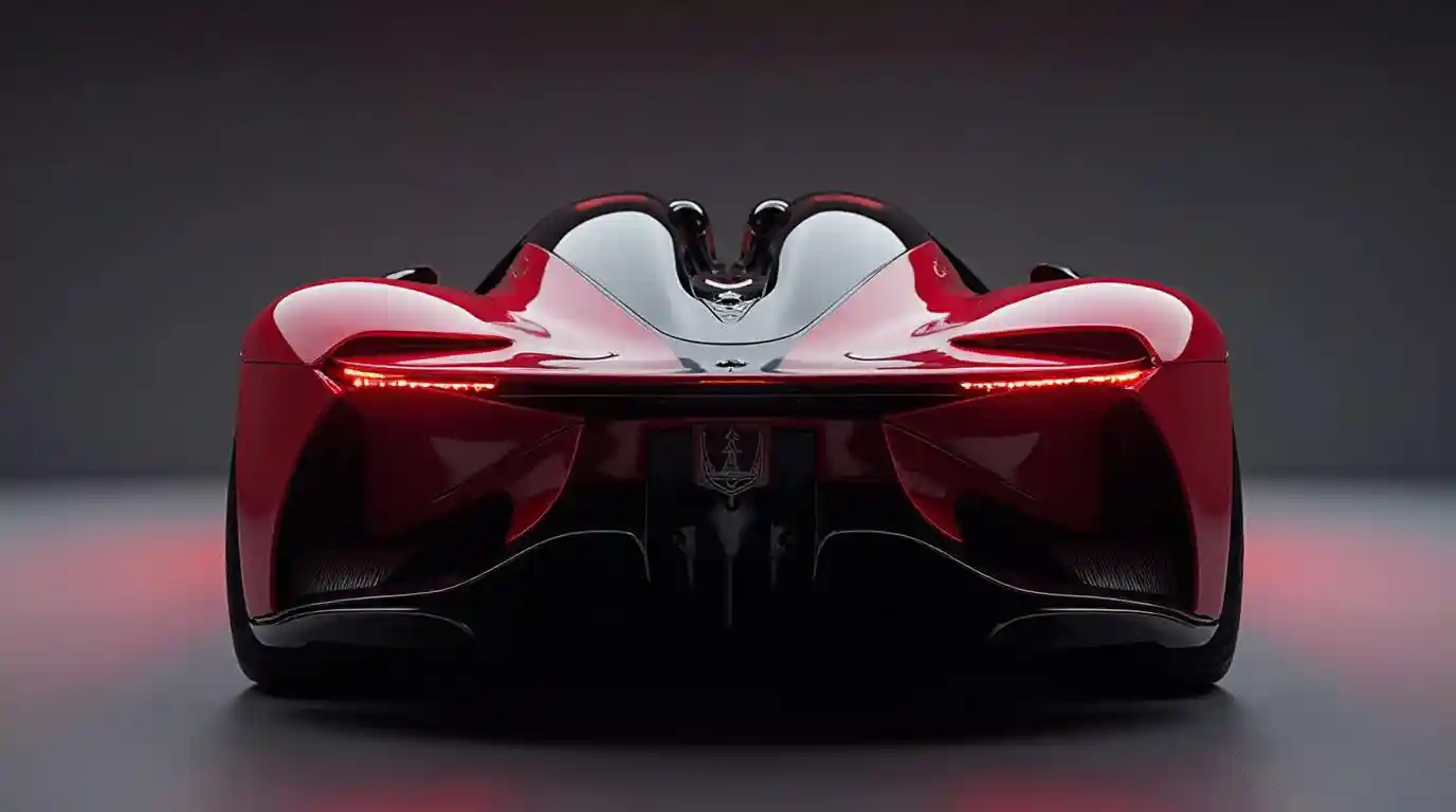 The rear of the hypercar, viewed from a three-quarter angle and inspired by Maserati, showcases a sleek, aerodynamic design in a captivating hue defined by RGB values of R: 234, G: 191, B: 164. Flowing lines create a streamlined silhouette, enhancing the car's performance aesthetic. Ultra-thin LED taillights are seamlessly integrated into the contours of the body, providing a modern and sharp look. Bold curves and black polypropylene accents emphasize its innovative character, making this rear view as visually compelling as the front, leaving a lasting impression.