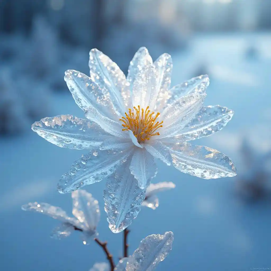 Imagine a flower crafted entirely from ice, delicate and translucent, as if meticulously sculpted from pure frozen water. This flower embodies the fragility and ephemeral beauty of a snowflake. Each petal features intricate details, resembling the crystalline patterns of frost. Light reflects off its icy surfaces, creating an effect of transparency and subtle iridescence. Role: As a digital artist specializing in natural textures and lighting, the model should render a realistic ice flower that appears almost ready to melt under soft, diffuse lighting, as if illuminated at dawn in a winter landscape. Task: Generate an image of a flower made from ice with fine, detailed features. Integrate gentle reflections on the petals, transparency effects, and a peaceful, cold ambiance. Ensure the color palette remains cool and soft, with shades of blue and white that evoke the purity of ice.