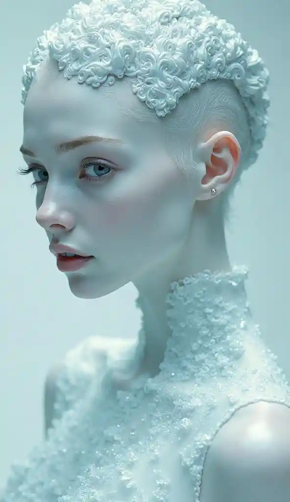 NoahThe surreal, highly stylized illustration captures the upper torso of a young woman with sharp, otherworldly features. Her porcelain skin shines like ice, and h
