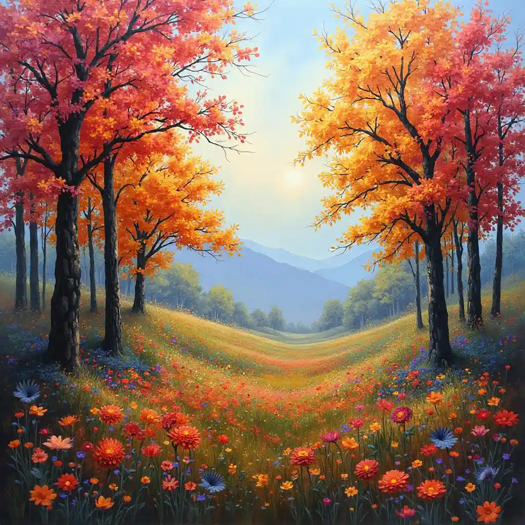 September landscape , Infused, Transparent, Iridescent, Trees and flowers