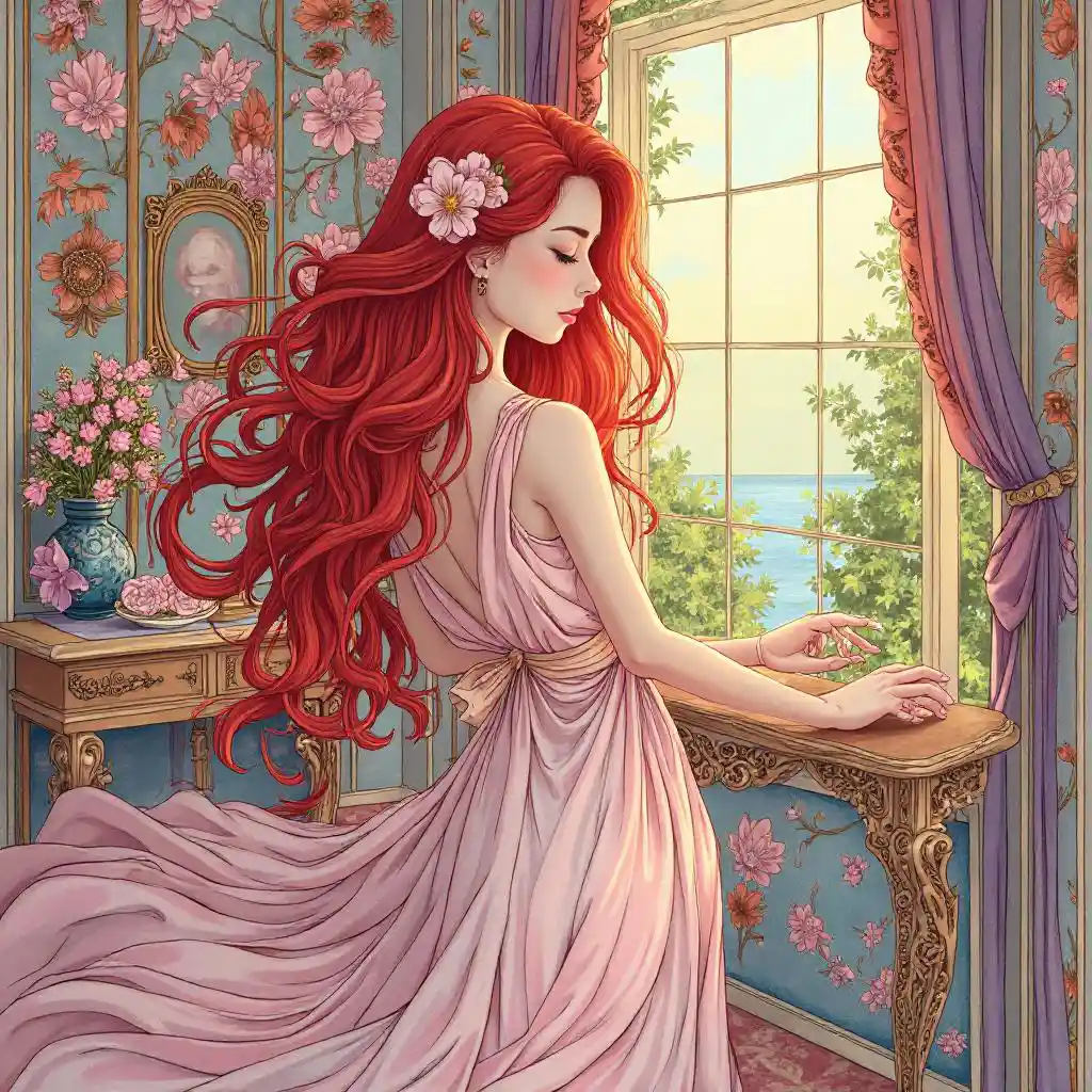Ink coloring and watercolor artistic painting, gentle woman, flowing deep red long hair, gravibrant spring green ceful pose, colorful ornate living room with nlarge window , vivid alcohol ink colors,abstract art, dreamy atmosphere, tranquility and beauty, digital illustration, detailed and vibrant, soft lighting, ,in shades of lilac pink, pastel yellow, pearly white and vivid coral, radiant motifs on the walls, intricate,ornate, Art Nouveau and surrealism, with intricate details, extremely high quallity, high resolution, highly precission outlines, detailed strong outlines, coloring in alcohol ink pigments, Charging technique, alcohol ink watercolor painting ,opalescece hues, Clear and clean colors , crystal clean pigmented pigments