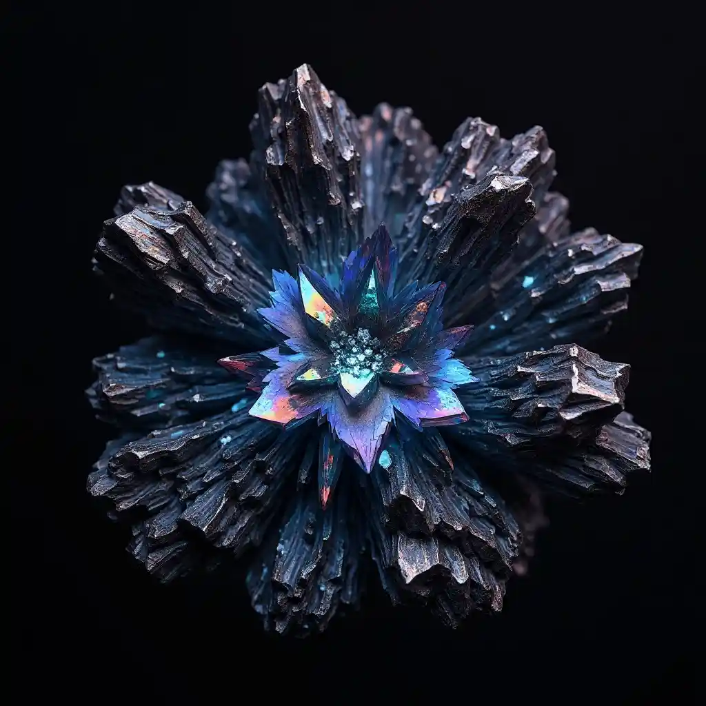 Black mineral, iridescent abstract formations, crystals, diffraction, fluorite, formations, gemstones, geology, illumination, iridescence, iridescent, light, metallic, opalescence, phosphorescence, radiance, radiant, rocks, spectrum