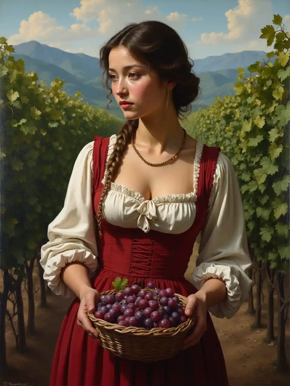 Oil painting on canvas. Portrait of a young, dark and beautiful Italian girl growing red grapes from Sicily in 17th century Italian folk peasant clothing with low cut and full breasts, dramatic lighting, depth of field, Vineyards with clearly and regularly defined shapes in the background. The grapes should have a beautiful, even structure. Incredibly high detail, holding a basket of grapes in your hands, a wicker basket with the correct texture, grapes in a basket of the correct texture with beautiful berries.