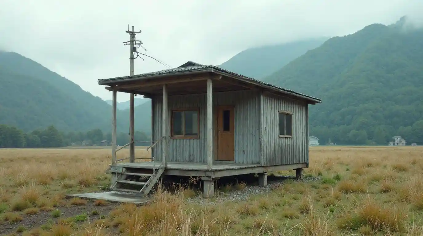 Side view of a tiny open platform in deep rural japan in the open with no roof, empty exposed platform, telephoto lens, isometric, front view