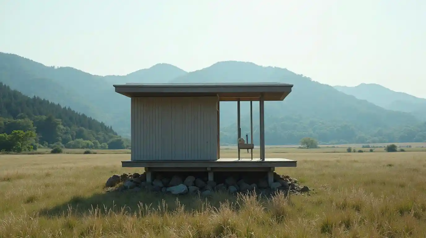 MackenzieSide view of a tiny open platform in deep rural japan in the open with no roof, empty exposed platform, telephoto lens, isometric, front view