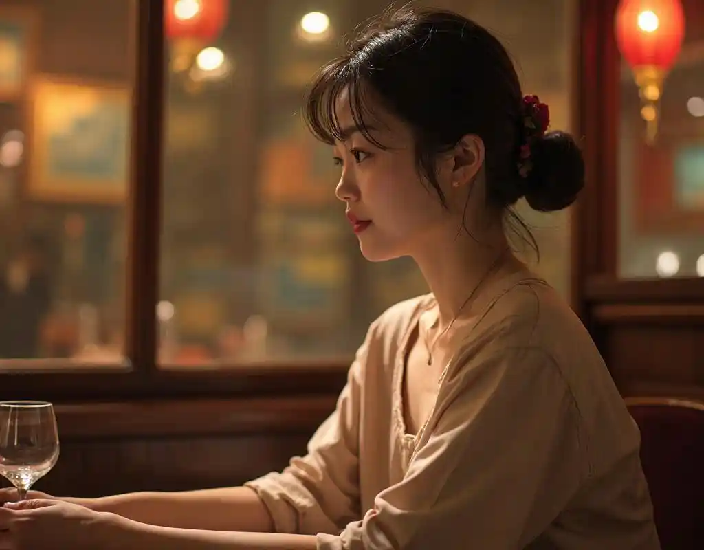 Josephbeautiful Japanese women, Female Spy, like a warm oil painting at a Hong Kong restaurant, photorealistic, from side:1.331, front view:1.331, close-up:1.1, (8k,