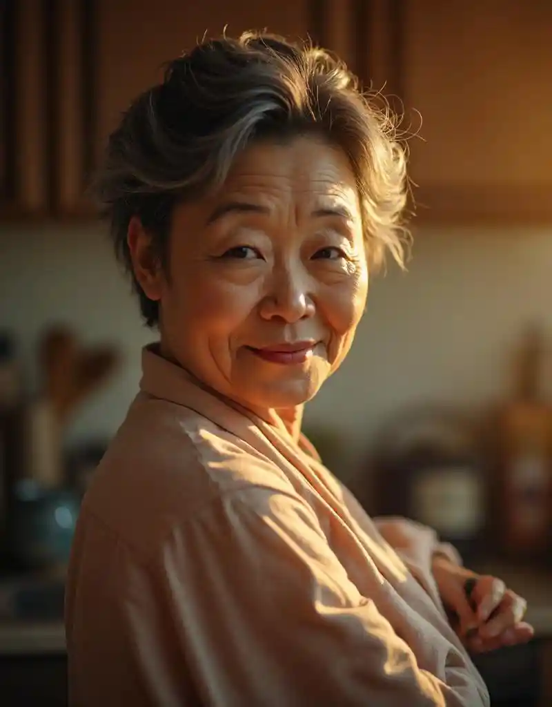 KinsleyMature Woman, Dramatic scene, ultra high quality, 8k, alone, close-up:1:21, kitchen:1.331, the sunset shines in, Beautiful 48-Year-Old Japanese Woman's Face, p