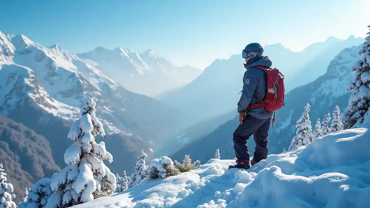 Jayakumar in the Himalayas, cold weather, ice ambiance, snow-covered peaks, breathtaking landscapes, chill atmosphere, misty air, adventure, serene quietness, wearing winter gear, surrounded by frosty trees, clear blue sky, dynamic lighting, crisp air, ultra-detailed, high resolution, travel photography style.