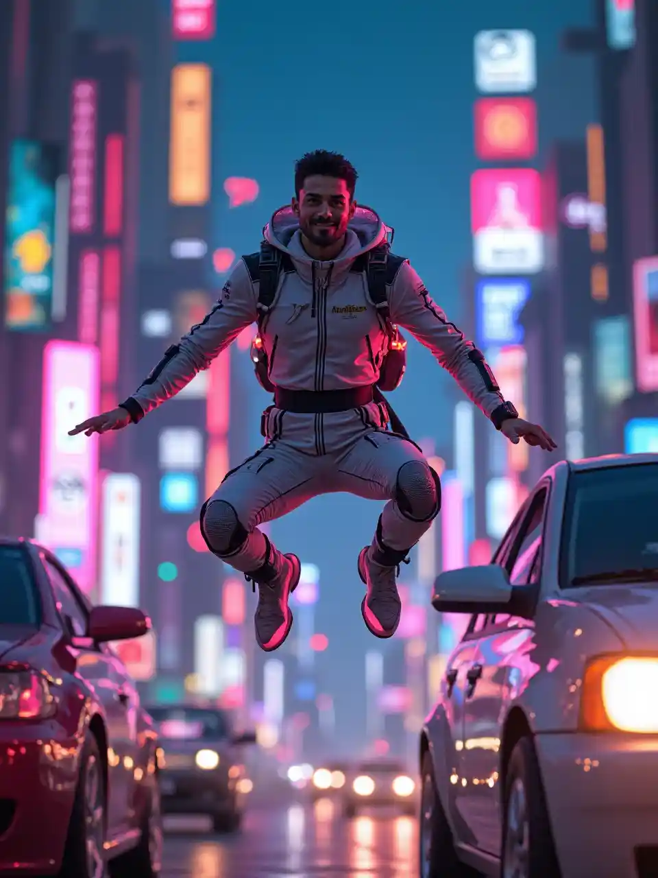 Riding a jetpack through a neon metropolis, a Middle Eastern man in his 25s glows in a sleek flight suit. Holographic billboards and flying cars frame him, his bold maneuvers and fierce grin radiating cutting-edge charisma and urban adventure in a vibrant, high-tech scene.