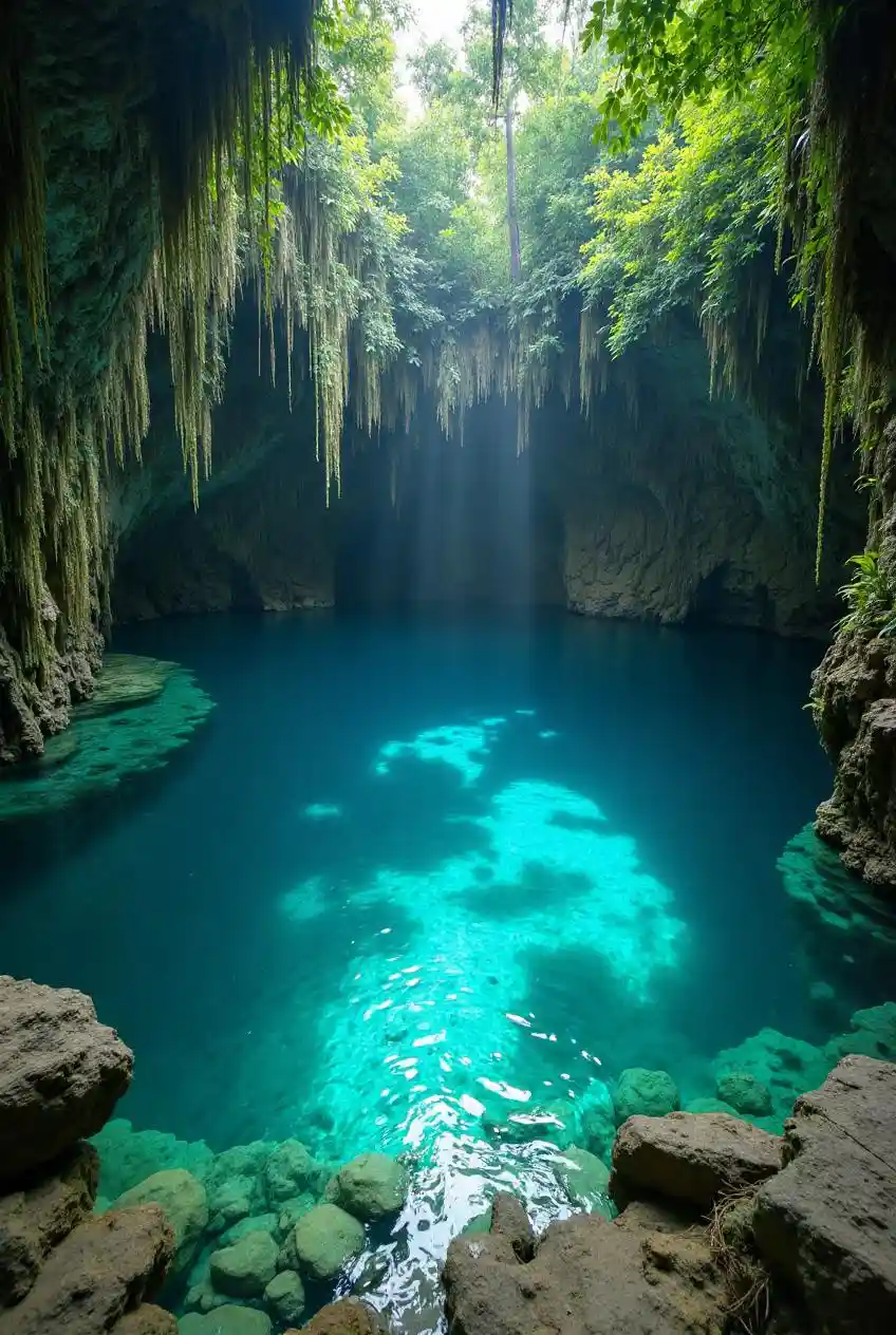 A massive crystal-clear cenote, hidden deep within a tropical jungle.