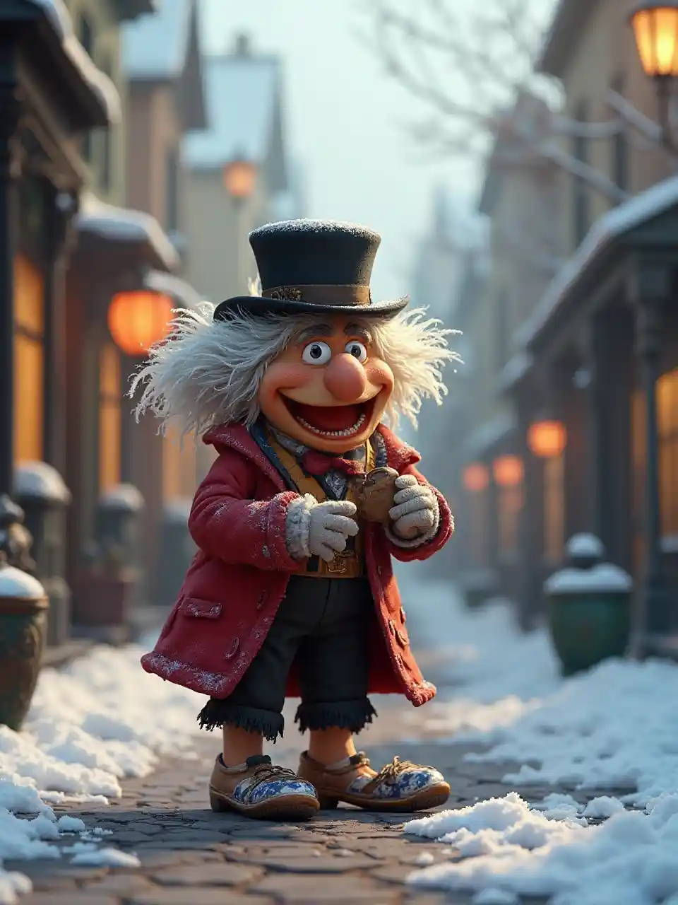 3D animation, kawaii, (((grumpy fraggle rock muppet Scrooge))), a snowy Victorian street