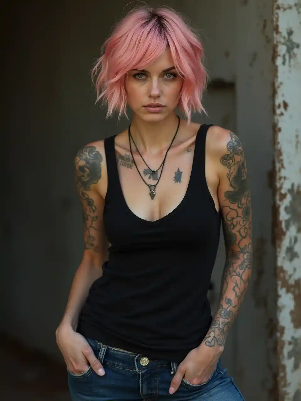 JaceKeira Knightley with short pink hair and tattoos in skinny jeans and black vest, shot from knees up