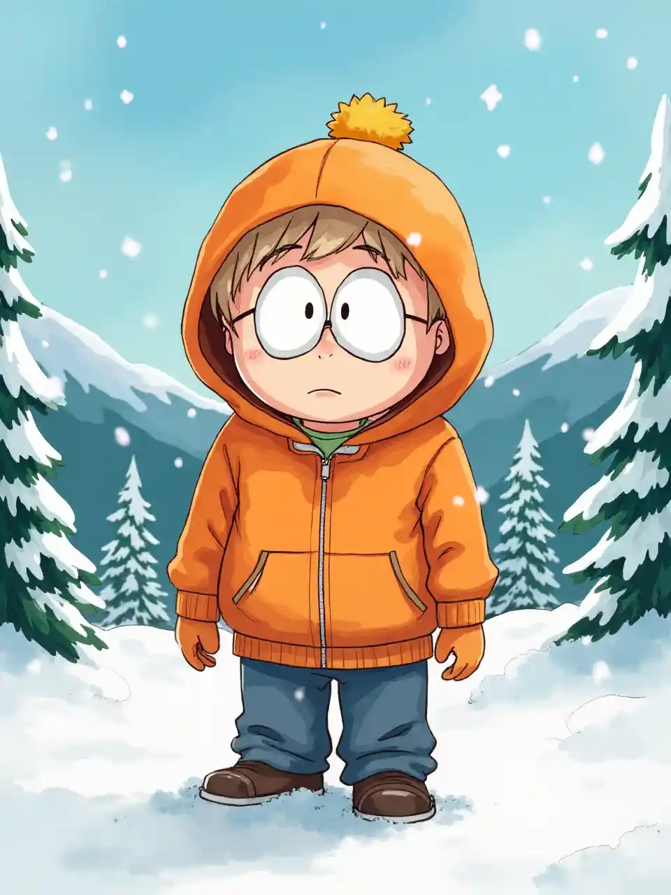 Watercolor illustration in anime style of Kenny McCormick from South Park in an orange hoodie standing in a snowy landscape