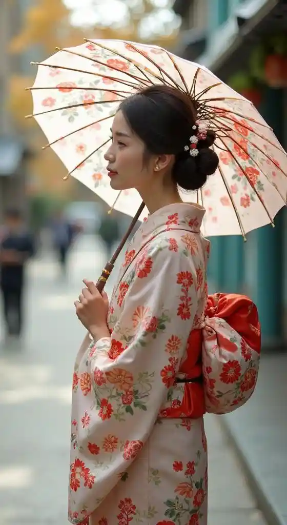 JacobThere is a woman wearing a kimono and holding a flower-patterned umbrella......, in a kimono, in a kimono, Kimono, pale and coloured kimono, Wearing kimono, wea