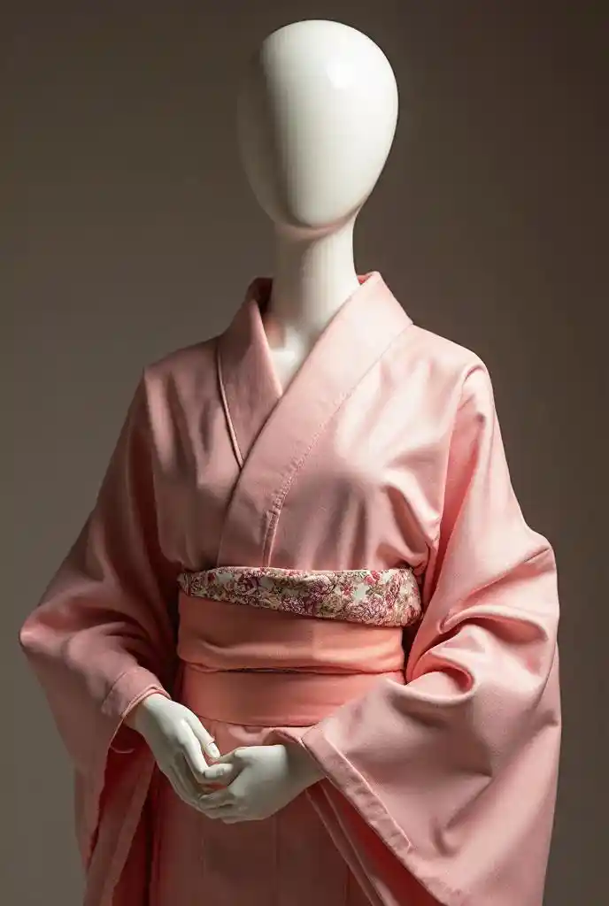 Jocelyna stunning portrait of mannequin with no facial feature wearing rose colored kimono, the kimono is very modest and highly detailed, the kimono is made of thick