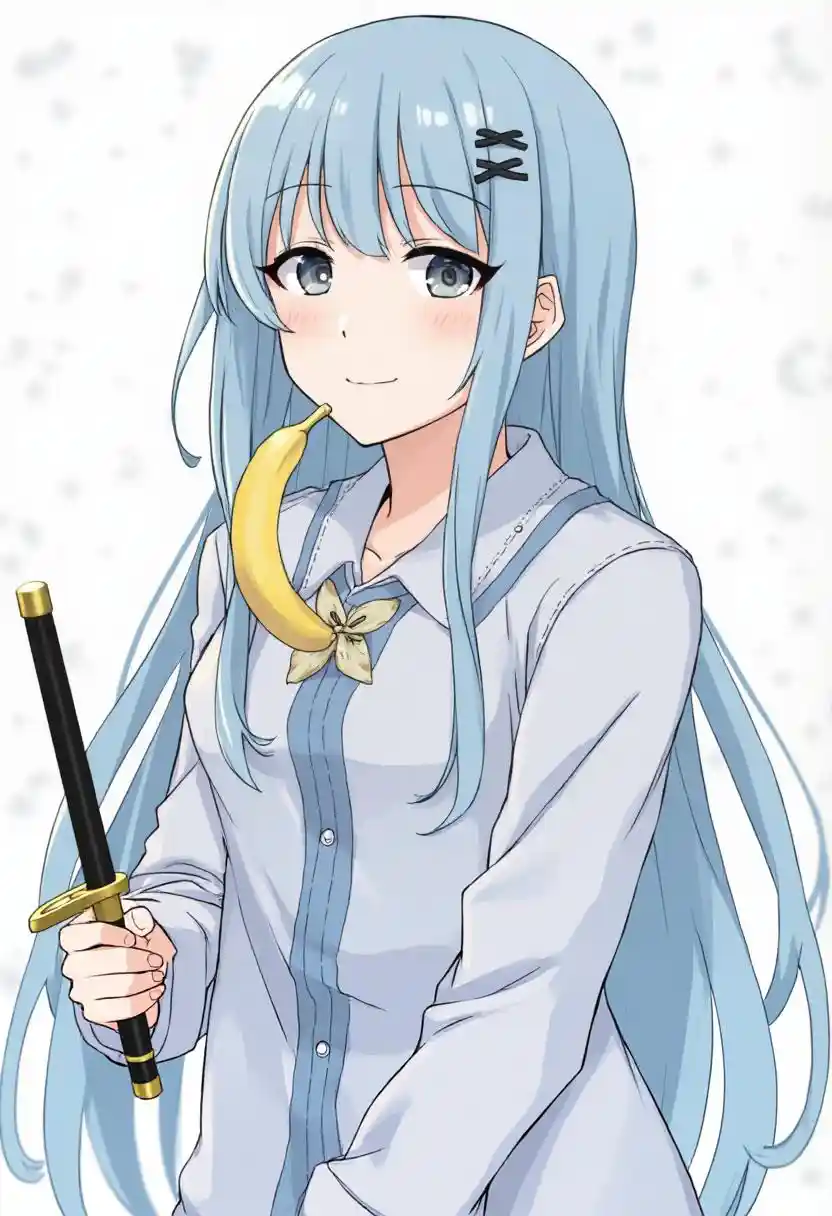 Mackenzie(The girl holding the banana sword). KIRYUUNORIKO , (girl friend beta) BLUE HAIR, HAIRCLIP, hair ornament, LONG HAIR, LOW-TIED LONG HAIR, GREY EYES,, large brea