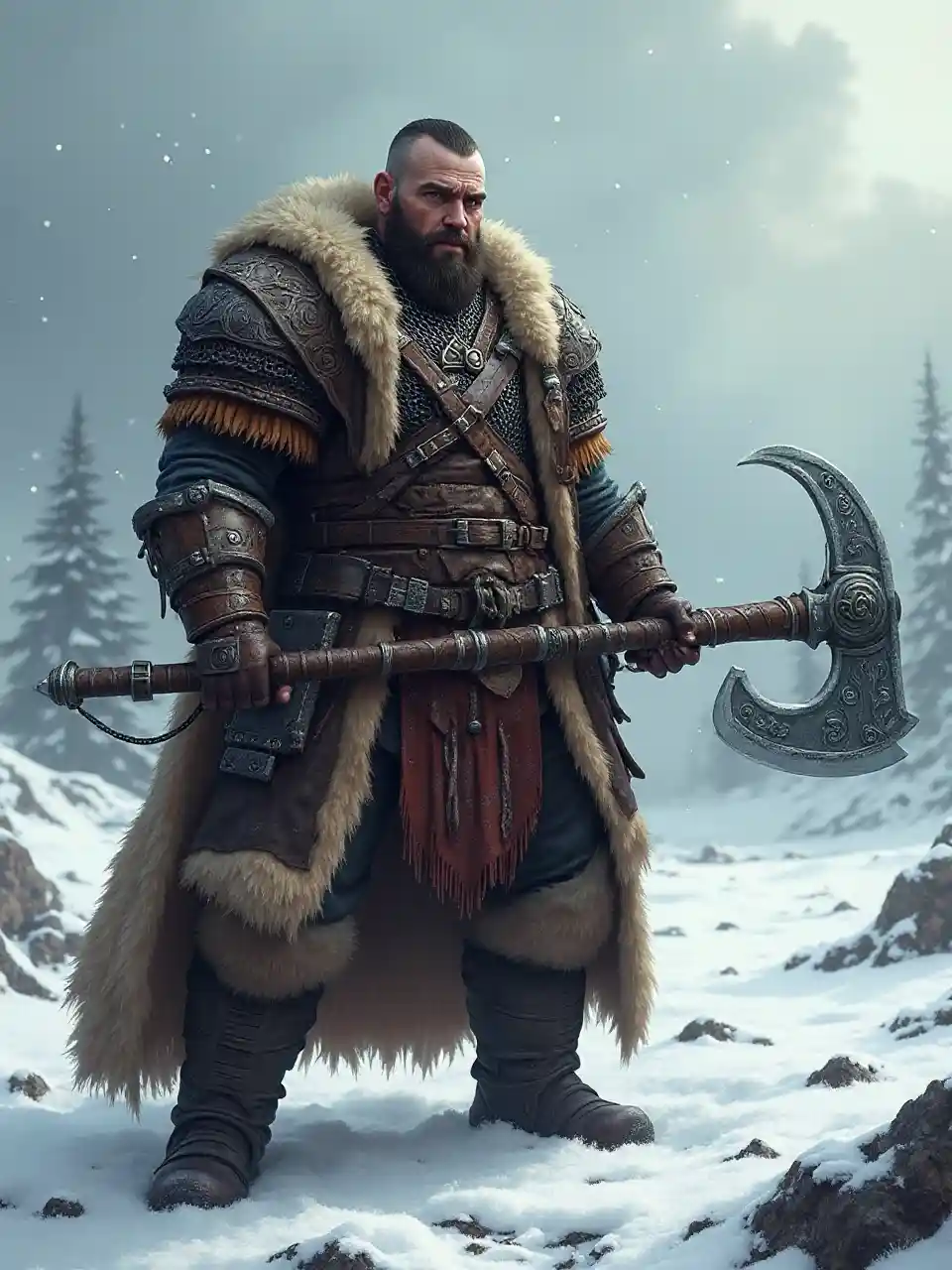 A rugged Kislevite Kossar warrior from Warhammer Fantasy, standing in a snowy, windswept landscape. He is 163 cm tall with a stocky, burly build, weighing around 100 kg, giving him a powerful and imposing presence. He is dressed in a chainmail hauberk with a long, fur-lined leather coat over it, adorned with intricate Kislevite patterns. His attire includes thick fur boots, a fur hat with a metal emblem, and a heavy belt with a curved saber and a dagger. His face is clean-shaven with no beard, only a thick, well-groomed mustache. His expression is fierce and determined, with sharp, piercing eyes. In his hands, he wields a massive two-handed war axe with intricate carvings on the haft. The background features a frozen tundra with distant pine forests and a cloudy, stormy sky. The atmosphere is cold and harsh, with snowflakes falling and a sense of impending battle. Highly detailed, realistic, and immersive, in the style of dark fantasy art.