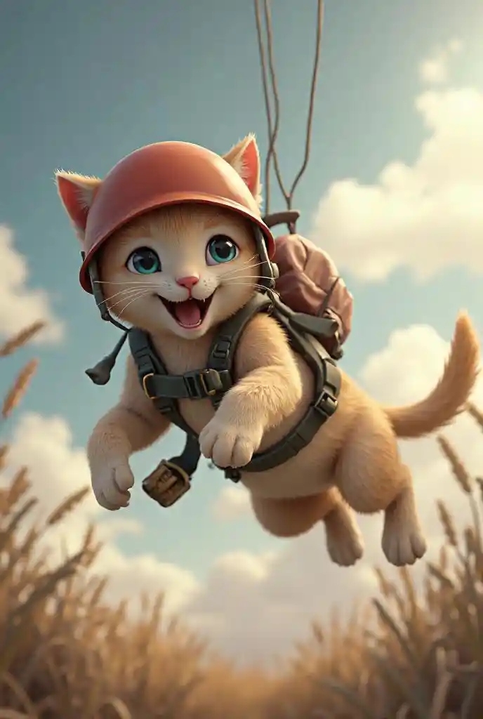 An animated picture of an anthropomoprhic cute kitten paratrooper is parachuting down behind enemy lines while a clueless and cute anthropmorphic golden retriev