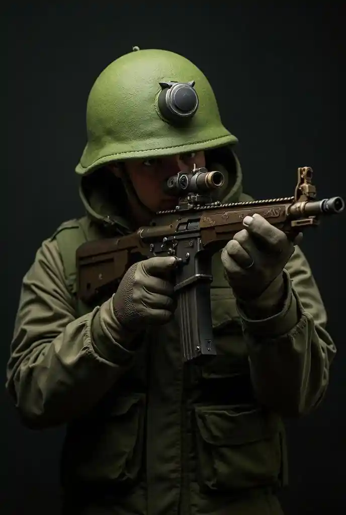 GiselleA us soldier aiming a kiwi fruit gun. dark background