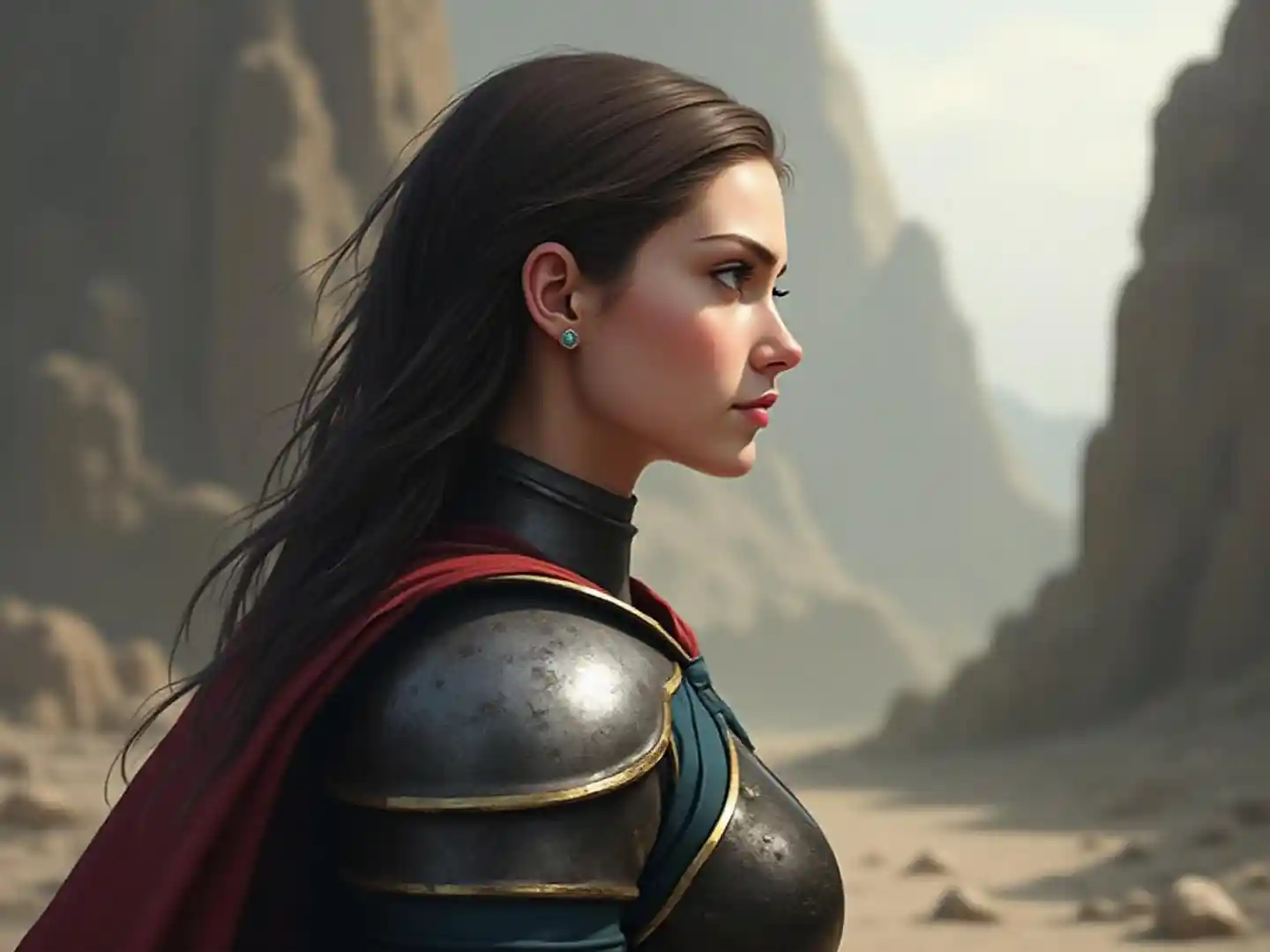 Masterpiece, ultra-detailed digital painting of a heroic female knight (age:25-30), Caucasian, in profile view gazing into the distance with a determined yet se