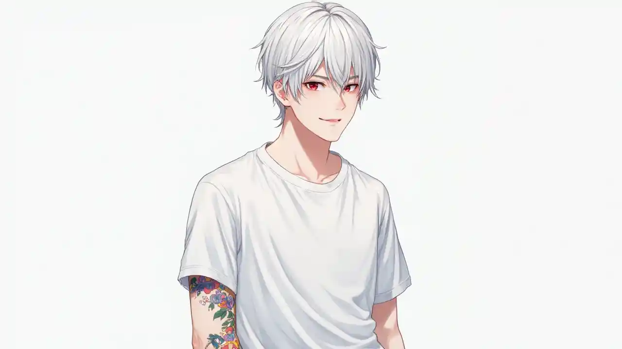 portrait of a beautiful Korean man, pale skin, anime, manga, white hair,k-pop, popstar, white background, white t-shirt, colorful tattoo on his forearm, angelic, effeminate