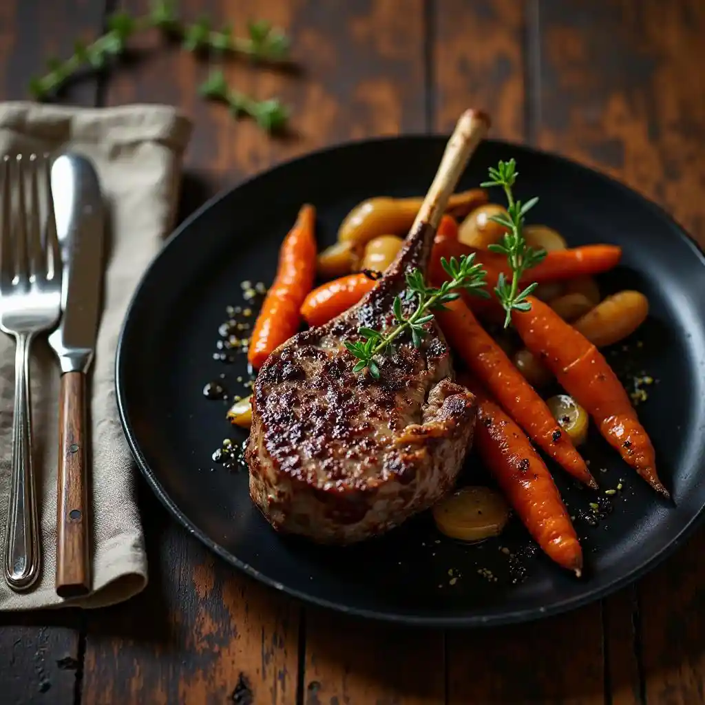 A beautifully arranged rustic table setting featuring a single black plate with a perfectly cooked lamb chop and roasted vegetables, including medium-sized carrots and caramelized onions, topped with sprigs of fresh thyme. The arrangement is complemented by a single specialized knife designed for cutting lamb chops and a single fork, both placed neatly on a rustic cloth napkin to the left of the plate. The scene is illuminated with soft, warm lighting that enhances the texture of the food and the wooden table underneath