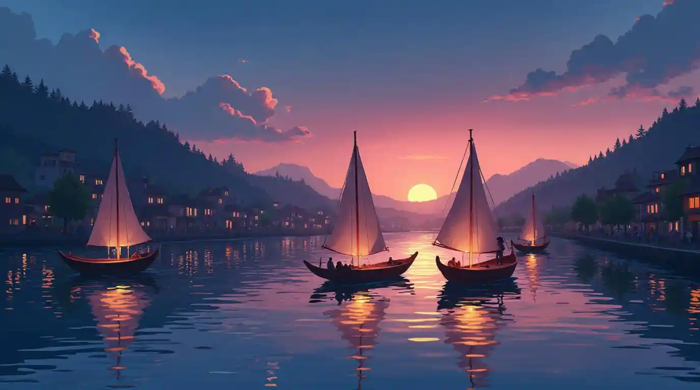 Seaside town at dusk, lantern boats setting sail, echoing serene slice-of-life anime aesthetics.