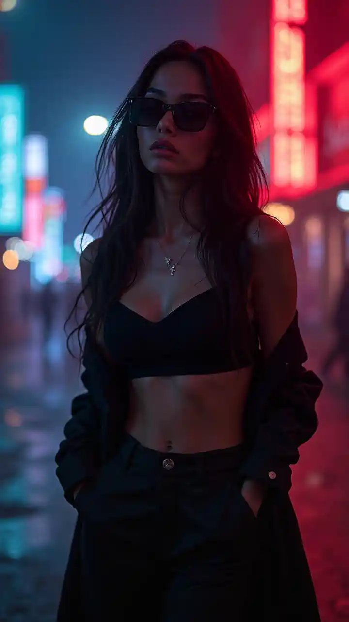 Elijahcity street, neon, fog, volumetric, closeup portrait photo of Hot Latina in dark clothes