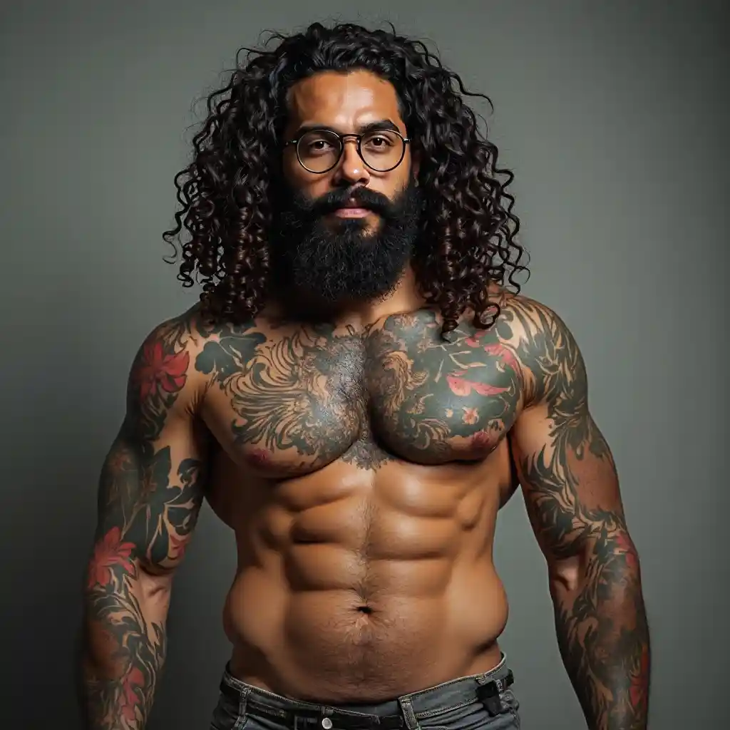 A Latino Man, who got a dad body with tattoos, glasses, beard and long curly hair → Long curly hair → Make him buff but still fat
