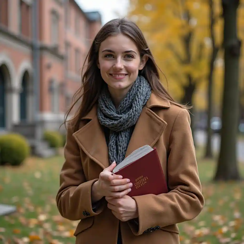 OliverLaw student girl with law book in university in autumn coat Law book in his hand