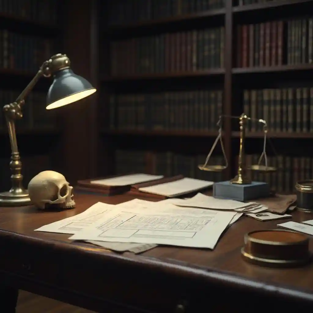 A wooden lawyer’s desk with scattered legal documents, a brass scale of justice, and, eerily, a human skull placed on one side of the desk. The background is a dimly lit office with legal bookshelves and soft light coming from a single desk lamp