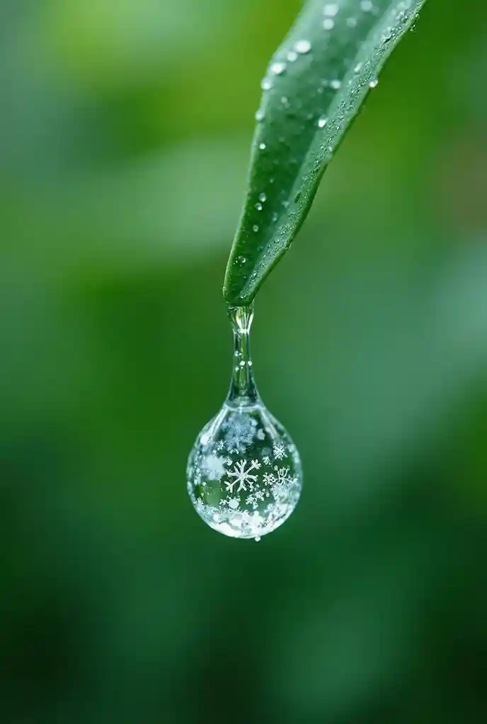microscopic image of a plant leaf with a drop of crystalline water falling from the tip of the leaf and deforming with gravity, there is a snowflake floating in