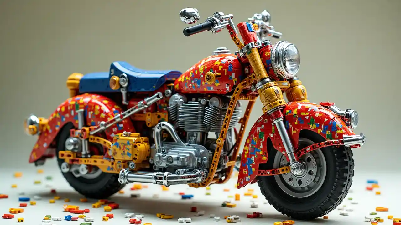 LandonA stunning interpretation of vintage extreme scooter, made of Lego pieces, advertisement, highly detailed and intricate, colorful, hypermaximalist,