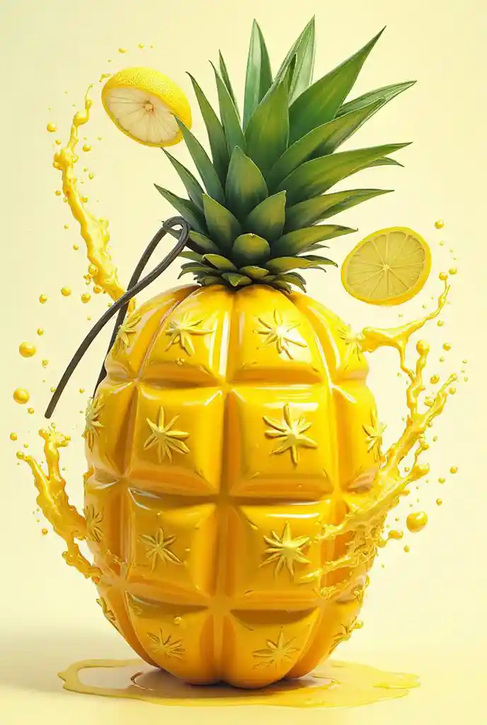 BettyDigital Image. Swirling jets and splashes of lemon juice. Detailed hand embossed American Pineapple grenade with lemon peel texture. Anti-personnel fragmentatio