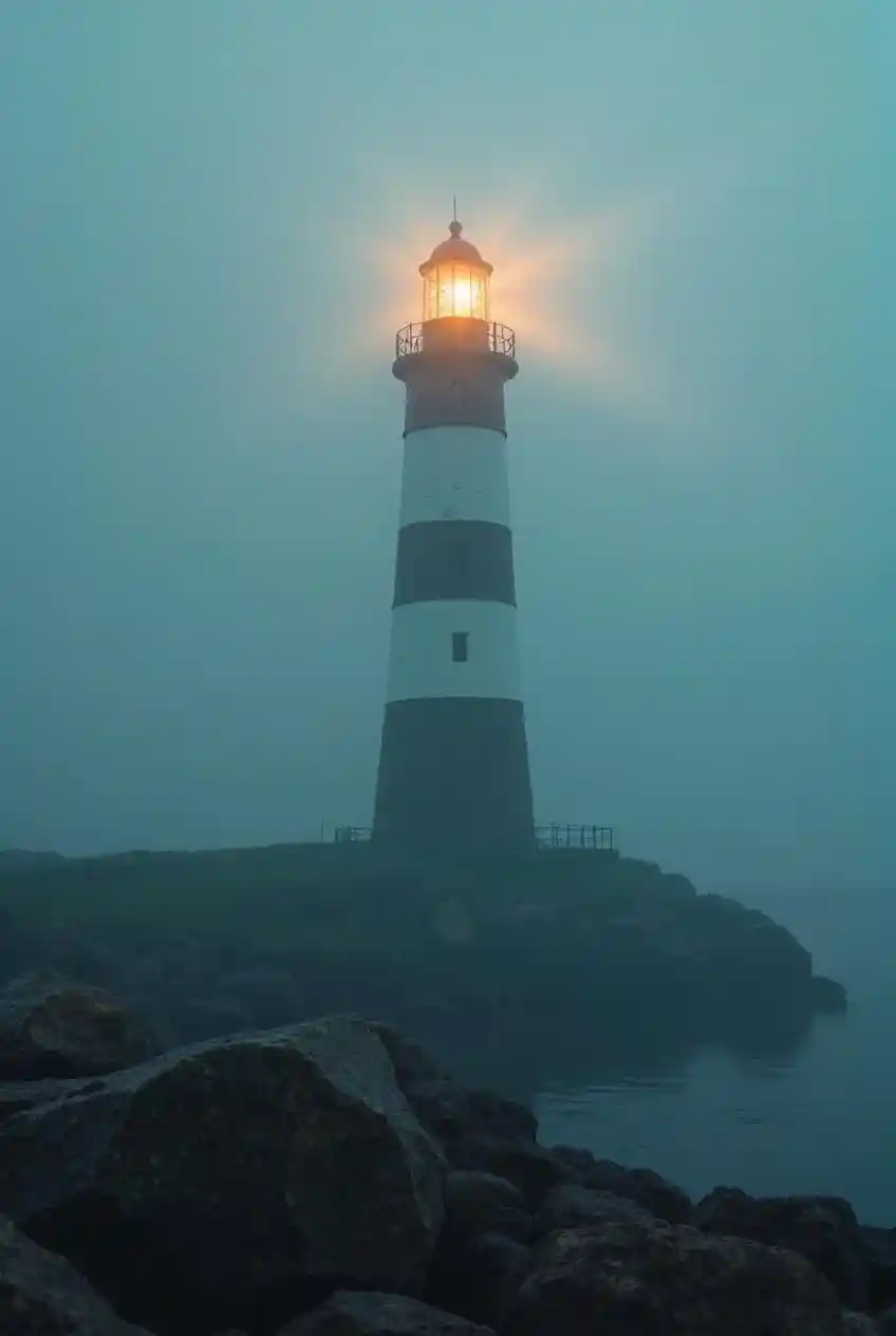 MadelynA lighthouse, its beam revealing stories in the mist.