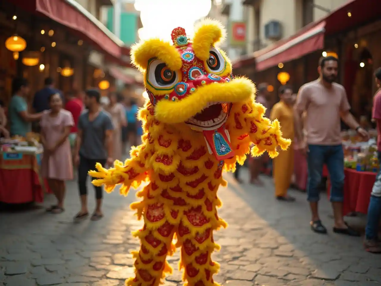 Performing a lion dance in a bustling market, a Middle Eastern man in his 20s glows in a vibrant costume. Colorful stalls and cheering crowds frame him, his dynamic moves and youthful energy radiating cultural pride and festive allure in a lively, exotic setting.