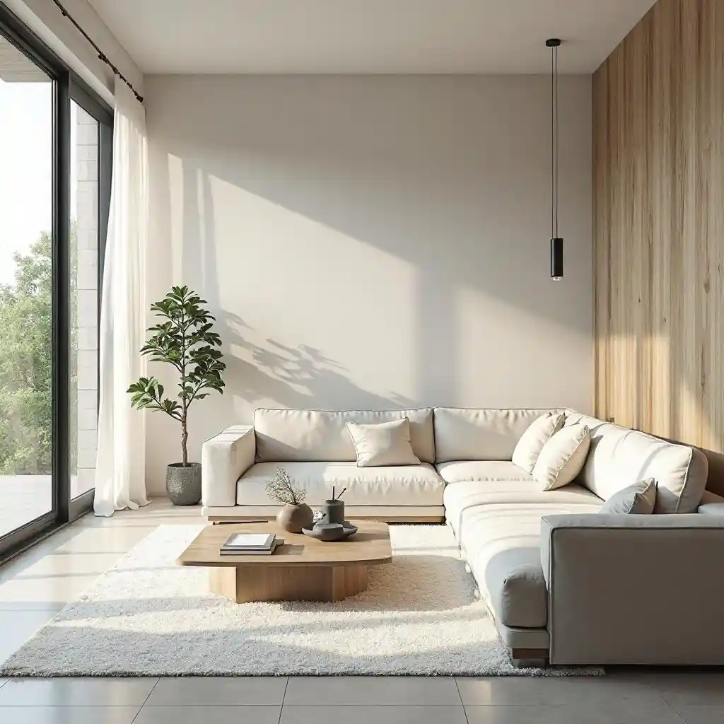 Camilaphoto-realistic rendering of Living Room with minimalist furniture, perhaps a straight-lined sofa and a large window to let in natural light.