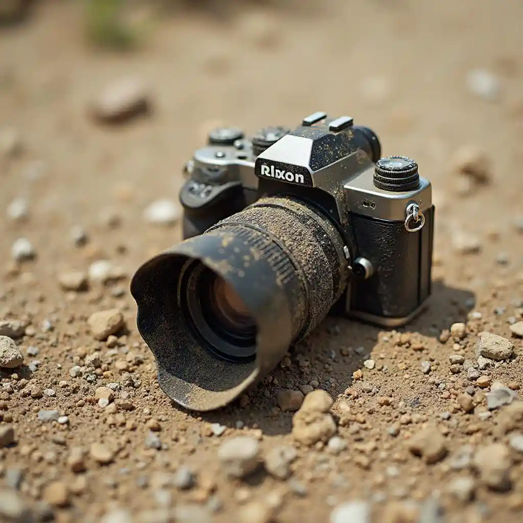 Sophiafrom above:1.21, SLR camera rolling on the ground, The lens looks at the sky, Damaged and dirty camera, Sand Dust, Camera without owner, Dry and stony ground, m