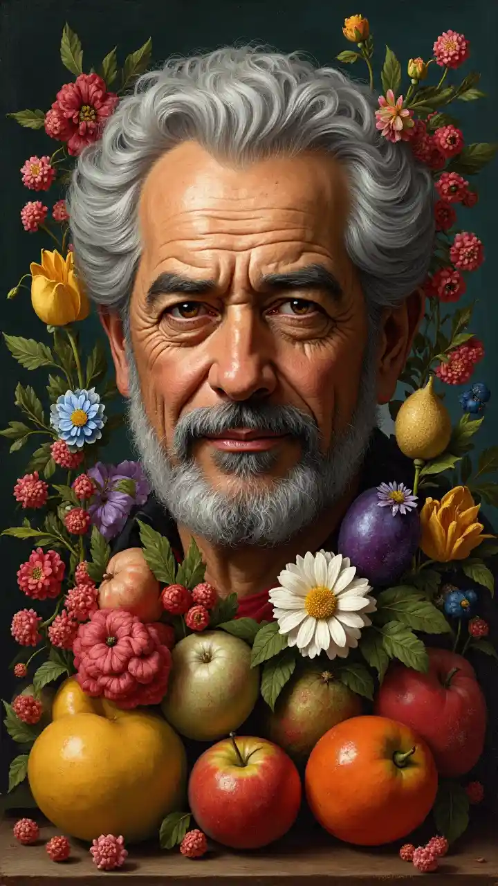 a painting of Brazil president Luis Inácio Lula da Silva head surrounded by flowers and fruit, Painting, Oil, Still Life, Botanical, Italy, style of Giuseppe Arcimboldo